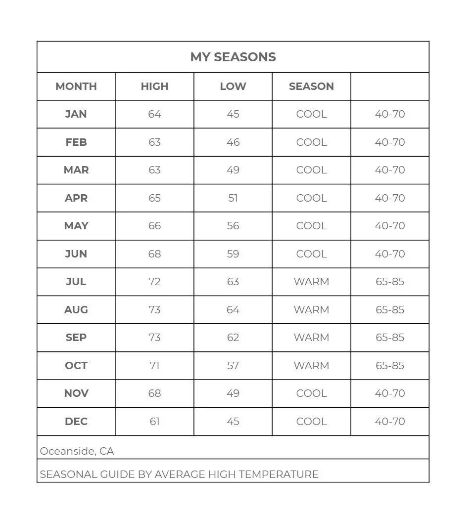 Using the data above, the average high and lows data is recorded and assigned a season based on the average high temperature. Oceanside Coastal microclimate does not get cold enough to qualify for a cold or hot season. Keep that in mind when planning.